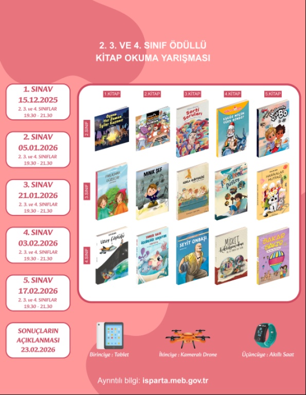 Isparta ili genelinde İlkokullar düzeyinde 2. 3. ve 4. sınıf öğrencilerine ödüllü kitap okuma yarışması düzenleniyor. Yarışma sonuçları 23.02.2026 tarihinde açıklanacak olup, ilk üçe giren öğrencilere ödüller verilecektir. Yarışma ile ilgili ayrıntılı bilgi ve başvuru için aşağıdaki bağlantıyı TIKLAYINIZ